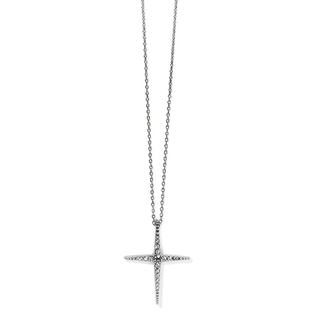 Four stunning rays of pavé crystals radiate outward from a center square stone to create this delicate, modern cross pendant necklace. It is reversible with an all silver sculpted beaded design.