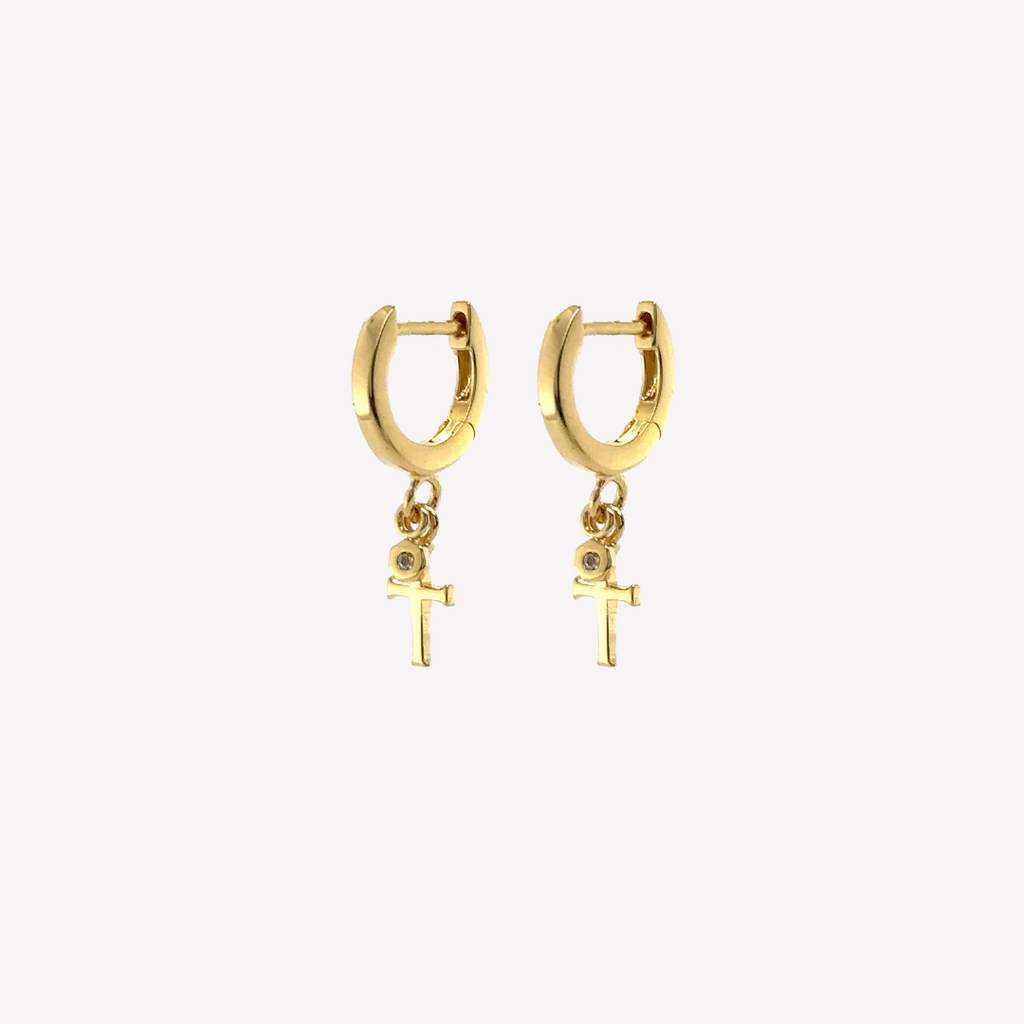 Our huggie hoop earrings feature the classic Rizen cross shape layered with a delicate white topaz. Both charms freely dangle from a sleek hoop with hinge closure.